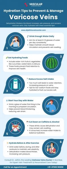Hydration plays a key role in maintaining healthy veins and preventing varicose vein discomfort. Drinking plenty of water, reducing salt intake, and avoiding excess caffeine can improve circulation and reduce swelling. Before trying any home remedies, consult Dr. Jathin, a leading vascular surgeon in Mumbai, for expert guidance and advanced treatment for varicose veins. Book your consultation today for the best care.