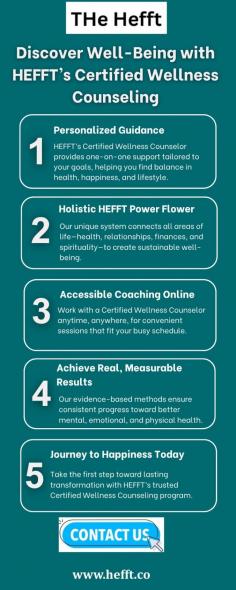 HEFFT’s Certified Wellness Counselor provides one-on-one support tailored to your goals, helping you find balance in health, happiness, and lifestyle. Experience personalized strategies that empower lasting growth and overall well-being.